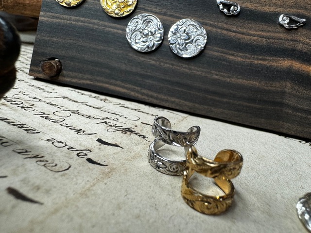 四角のsilver材を叩いて丸く加工し、 表面にスクロール・両側面にリーフの 彫りを施した贅沢なイヤーカフ。 鍛造にて製作している為、強度が高く サイズ調整をして割れるリスクが低いです。 また、叩き鍛えられたsilverの3面に彫りを入れてある為 耳元でキラキラと輝きます。 小ぶりなサイズ感の為 ピアスの様に着用頂けて、 マスクの邪魔になりにくいです。 大変手間の掛かる構造で、一点一点 手作業にて製作している為 欠品時には1ヶ月程お時間頂戴します。 材質:silver 表面に変色を抑えるロジウム・18kのコーティングを施しております。 ご要望により、燻し加工も承れます。 直径約15㎜×厚み約2㎜ 開口部分約3㎜