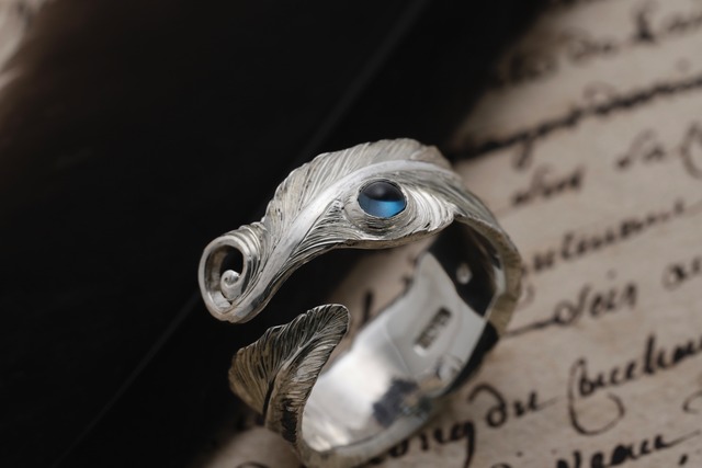 ※写真1枚目左側 軽やかな羽を追求し、手彫りにて表現した フェザーリング~ロンドンブルートパーズ~ 手彫りにて幾重にも彫り重ねた毛並みが光を反射し、シンプルながらも存在感があり、ロンドンブルートパーズを添える事で、唯一無二のフェザーアイテムに仕上げております。 長くご愛用いただける様に、 銀の板材から彫り出して整形している為、薄く軽やかでありながら頑丈な造りになっています。 材質:シルバー925 サイズ:約20号 ※フリーアームの為サイズ調整可能