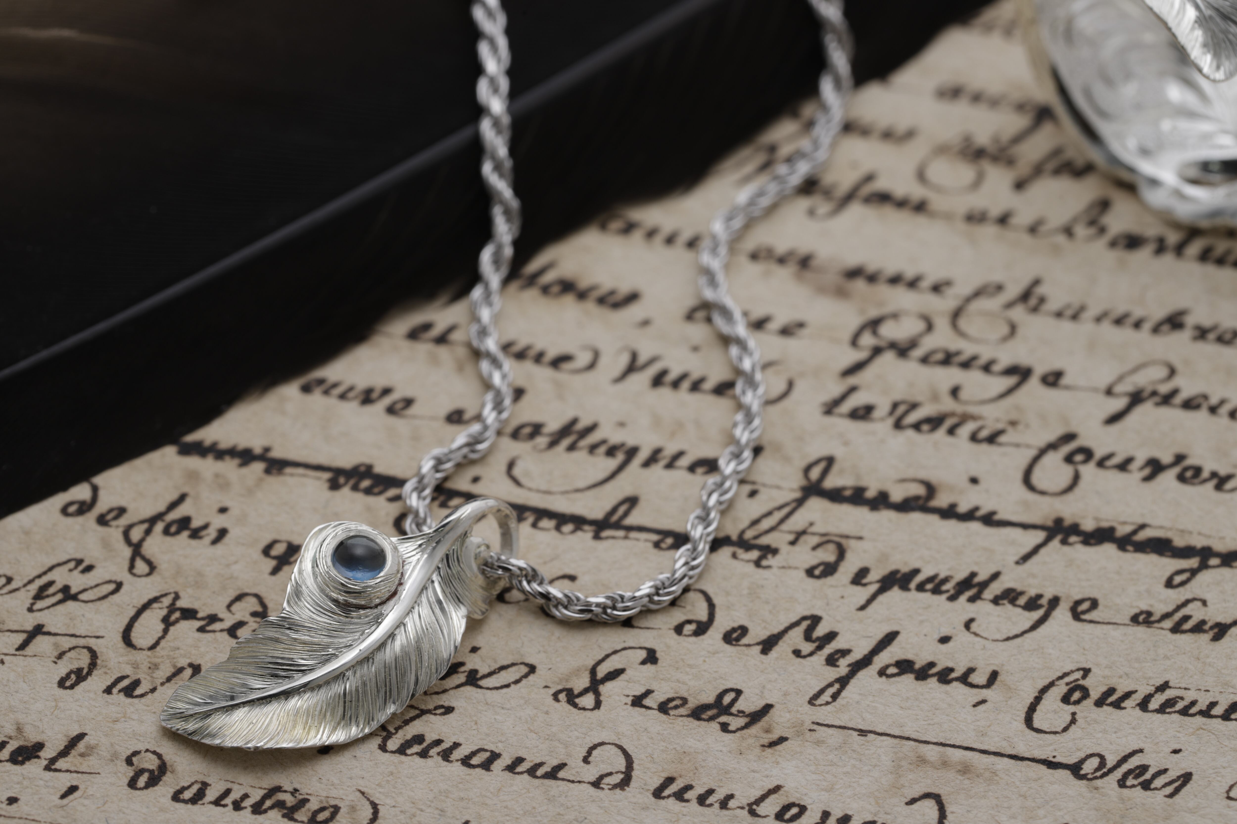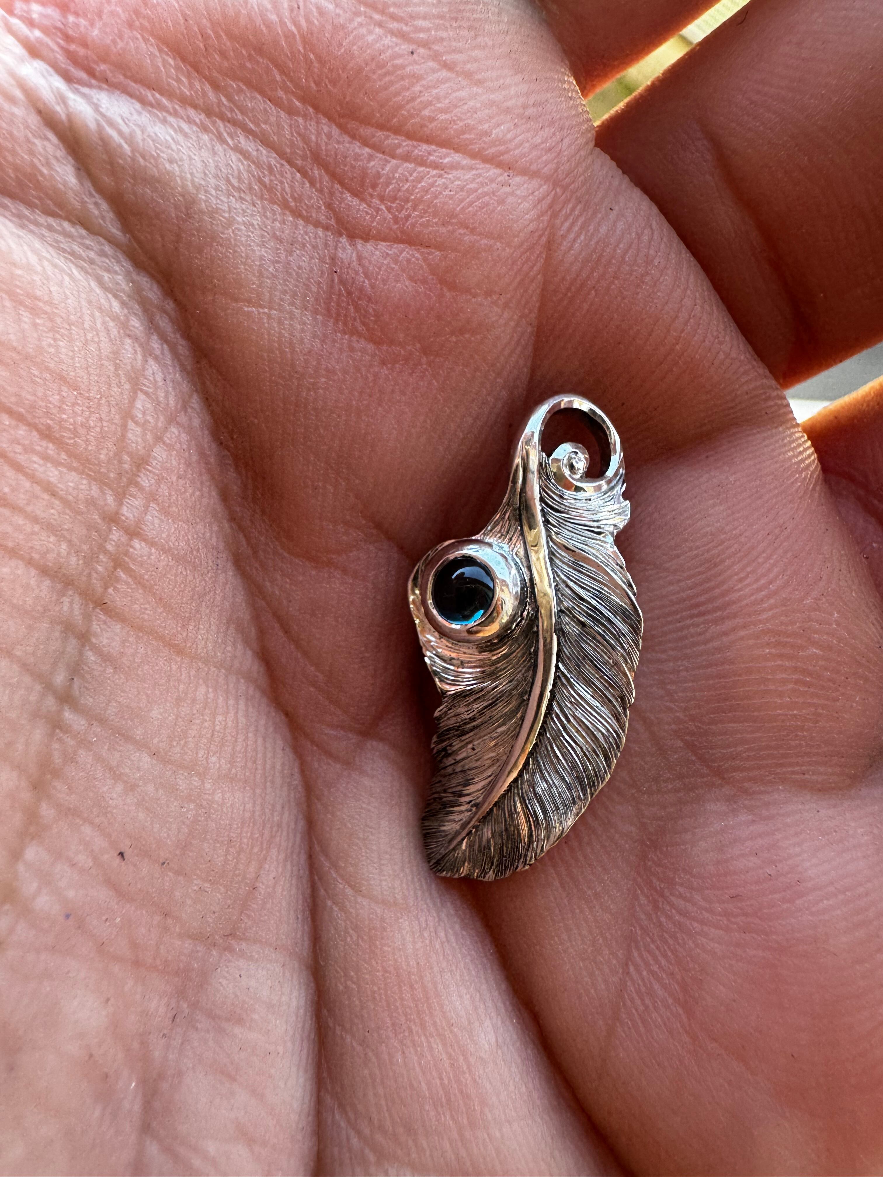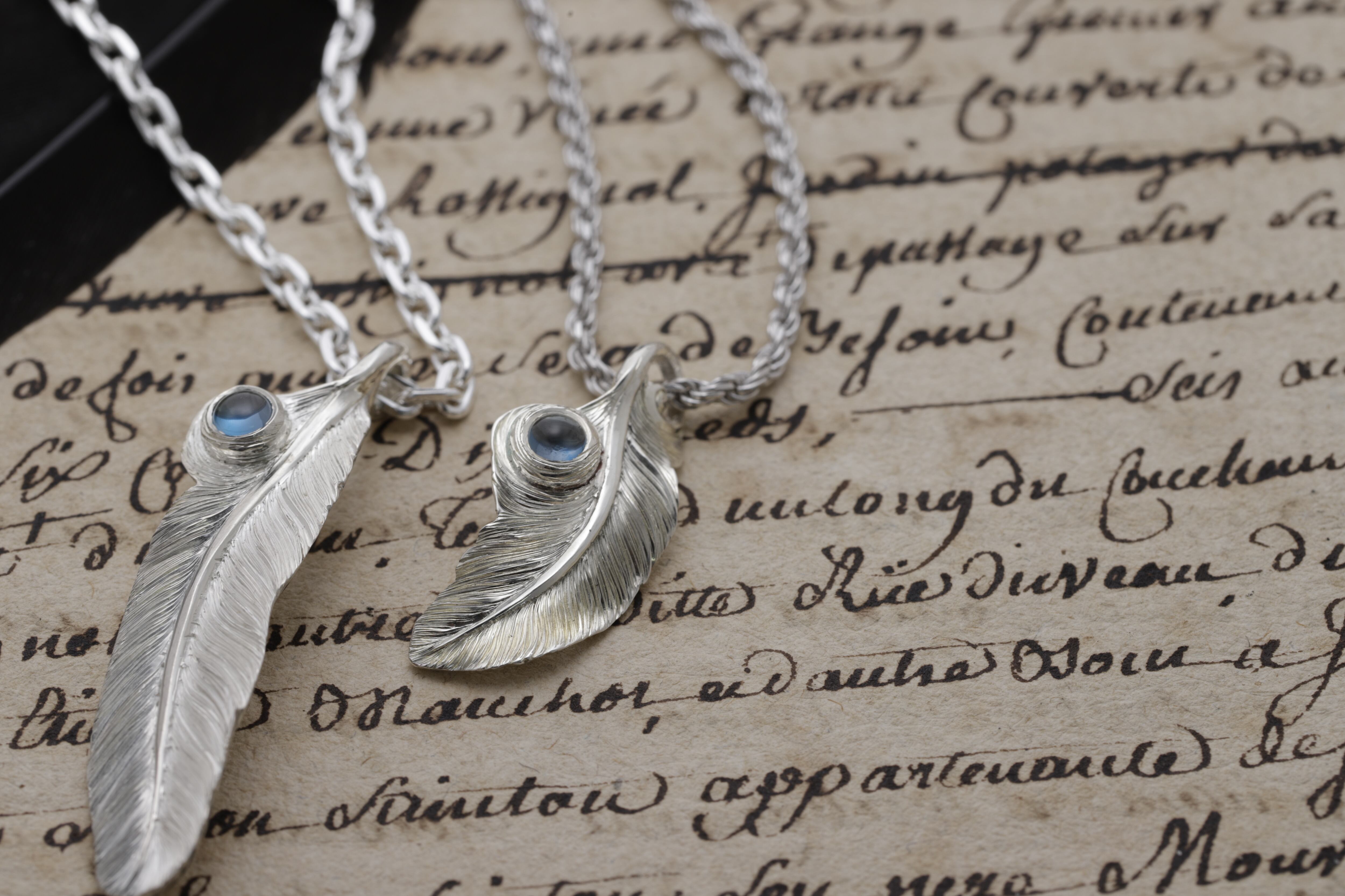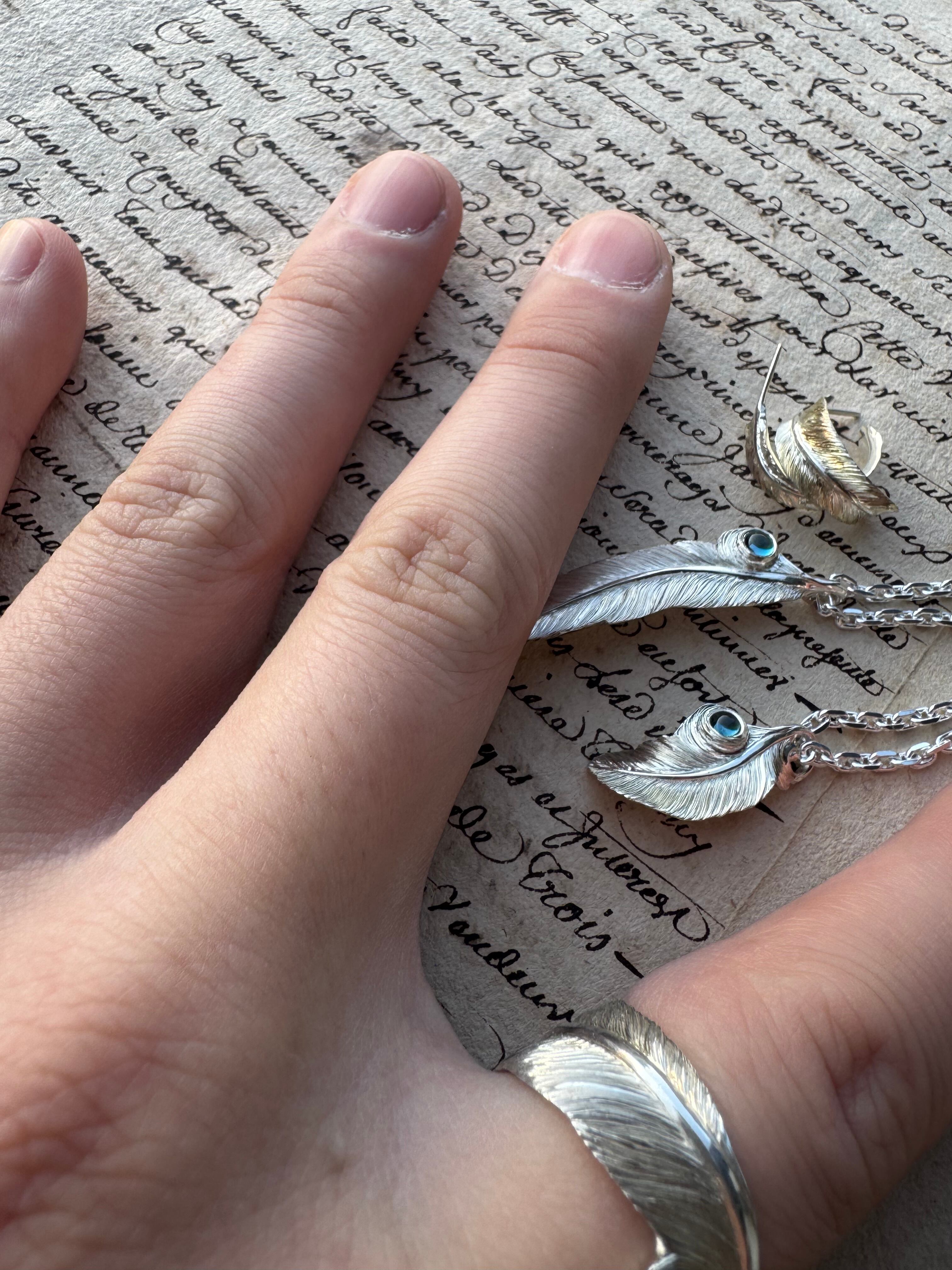 手彫りにて幾重にも彫り重ねた毛並みが光を反射し、シンプルながらも存在感があり、ロンドンブルートパーズを添える事で、唯一無二のフェザーアイテムに仕上げております。
