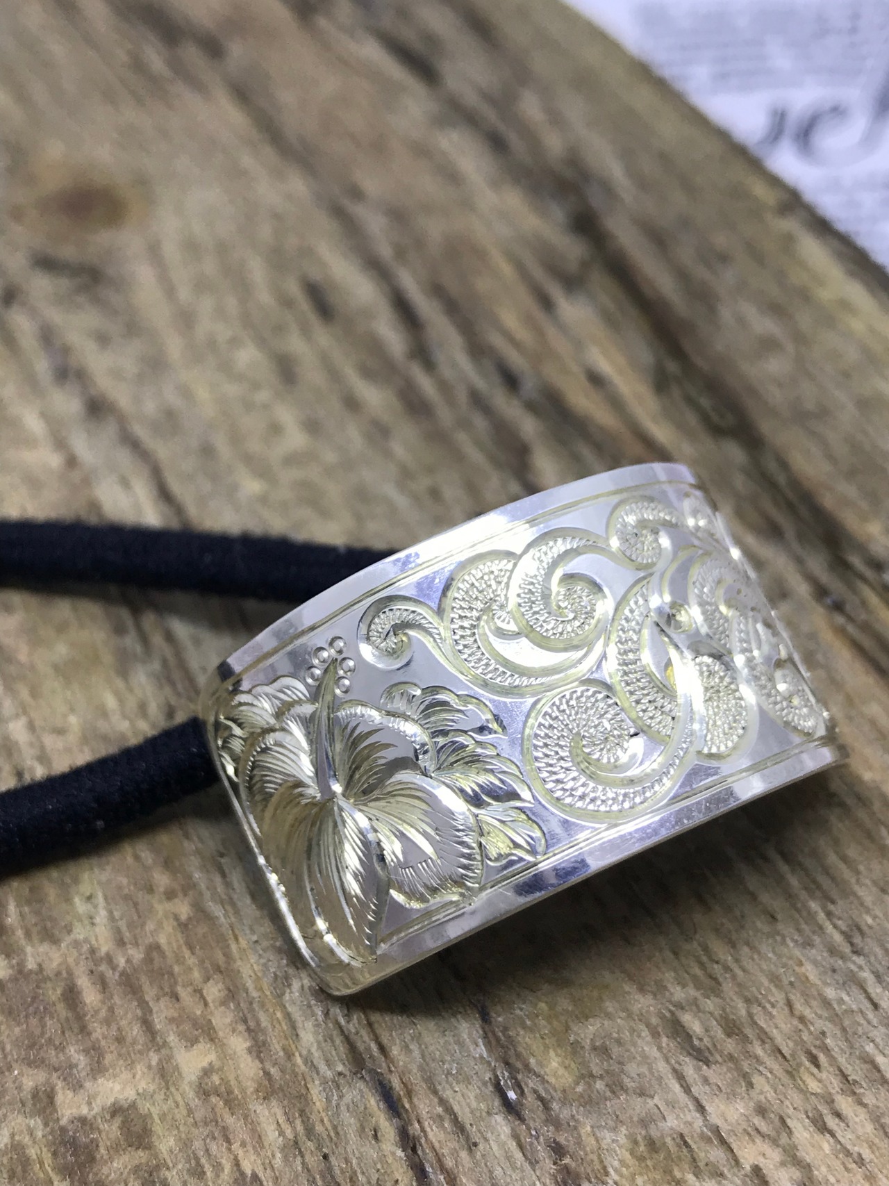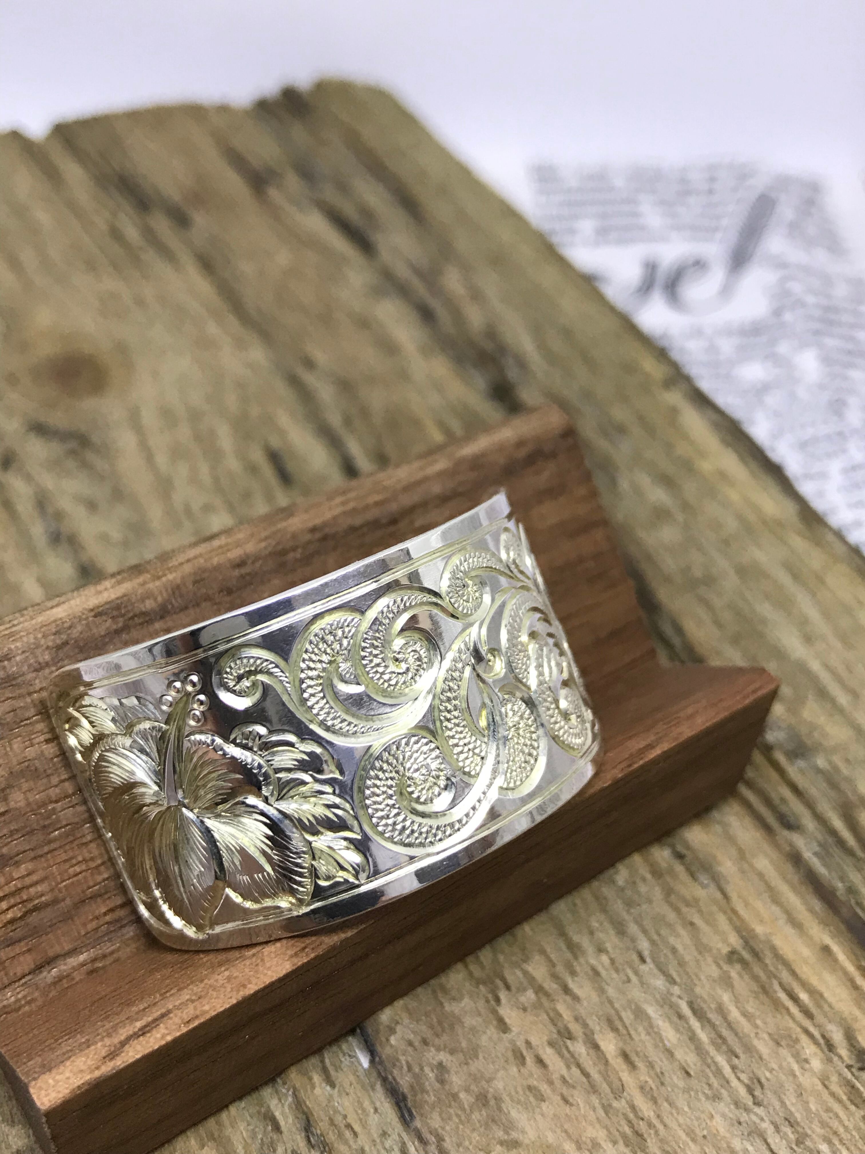 手彫りで全面にハイビスカス、スクロール(波)を入れた一点物。