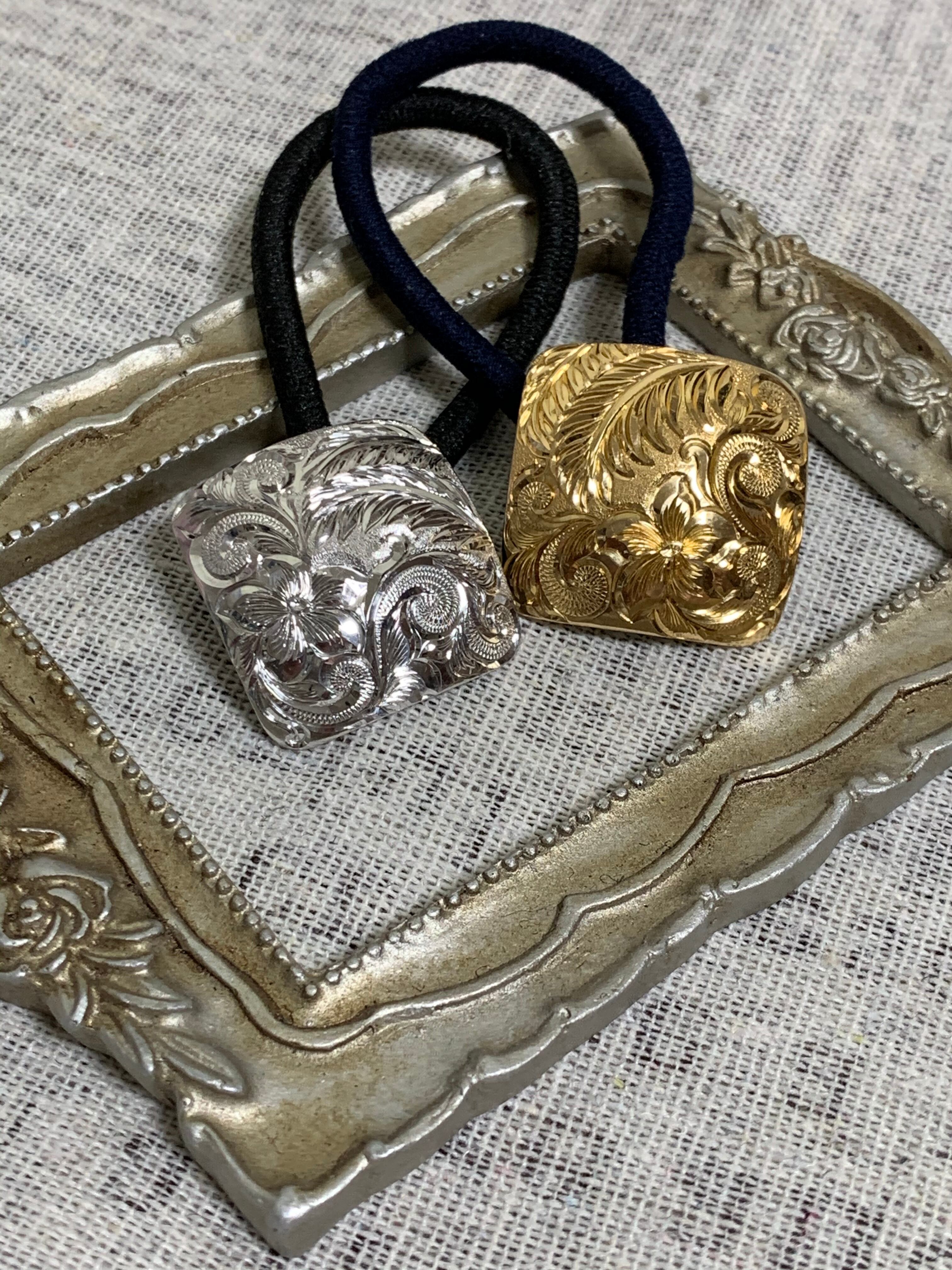 2019年末百貨店にて先行発売した際に大変好評だった凸面スクエア型のハワイアンジュエリーの手彫りを施したヘアゴム